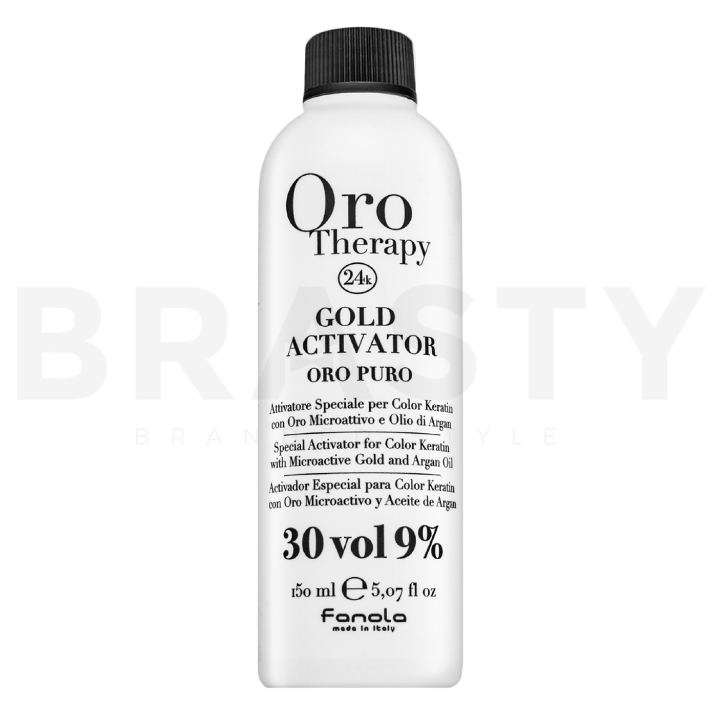 Fanola Oro Therapy 24k Gold Activator Oro Puro jerazvojna emulzija, zasnovana za barvanje in posvetlitev las z intenzivno nego in zaščito. Ta emulzija z 9-odstotnim vodikovim peroksidom (30 vol.) je idealna izbira za profesionalne tehnike barvanja in posvetlitve. Je del ekskluzivne linije Fanola Oro Therapy, ki izkorišča moč 24-karatnega zlata in drugih negovalnih sestavin ne le za doseganje popolnih rezultatov, temveč tudi za zagotavljanje hidratacije, sijaja in zaščite barvanih las. FanolaOro Therapy 24k Gold Activator Oro Puro je zelo učinkovita razvijalna emulzija, ki omogoča enakomerne in zanesljive rezultate barvanja in posvetlitve, hkrati pa lasem dodaja hranljivost in sijaj.